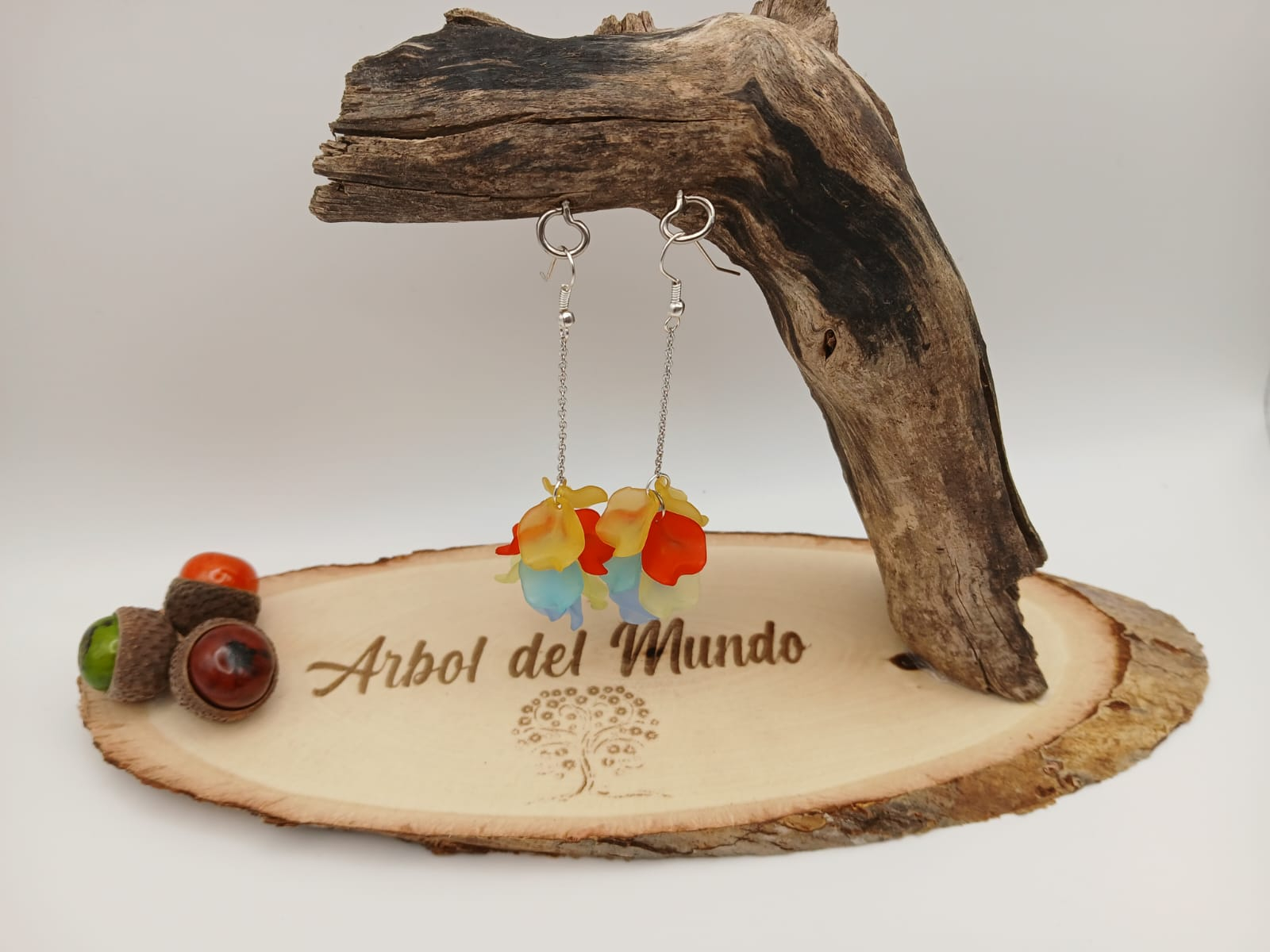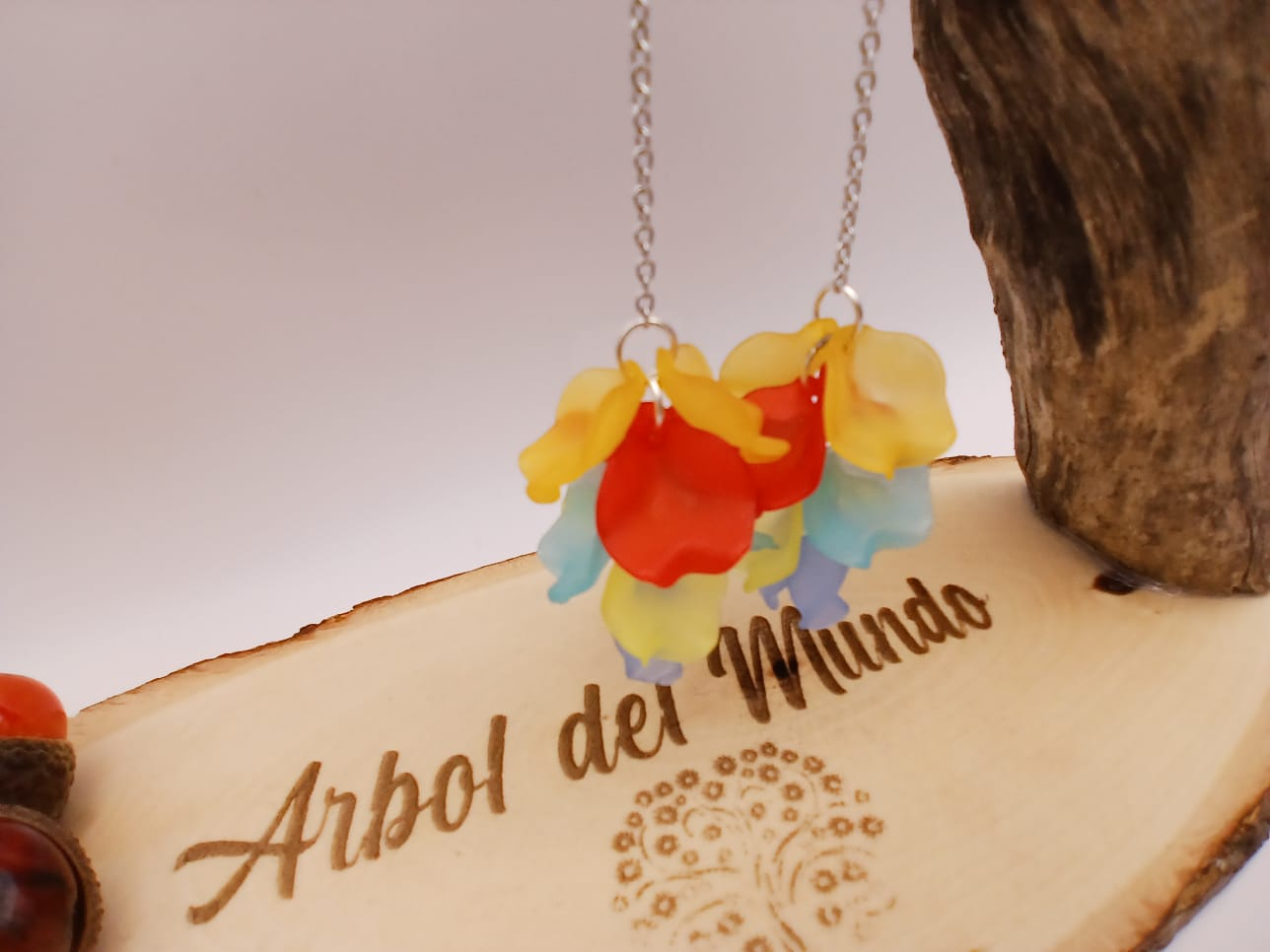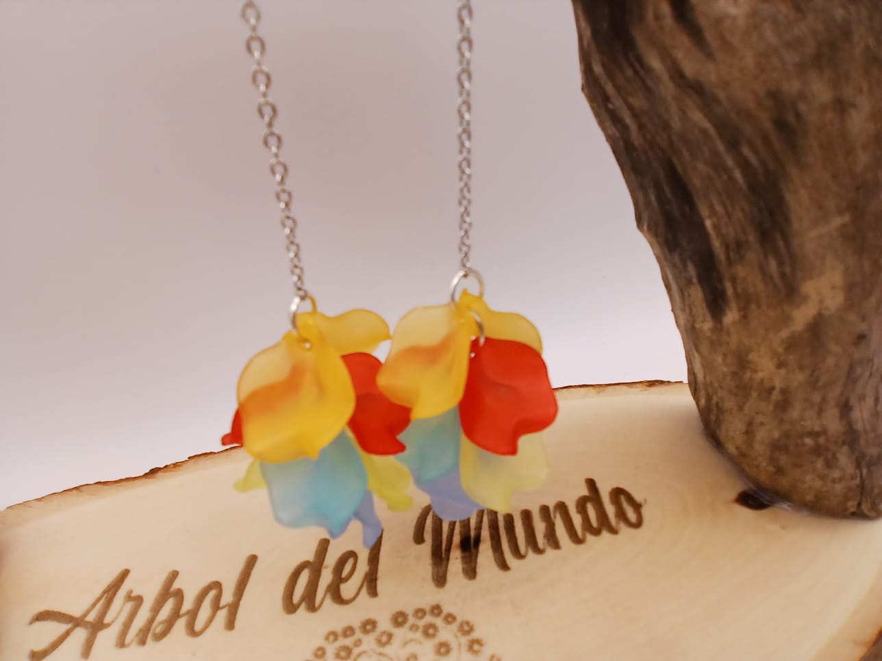 Cercei ultralight din petale acrilice. Pot fi purtați atât la ținute elegante, cât și la ținute lejere. Versatili și plini de culoare, pentru un look luminos și radios. Sunt extrem de ușori și nepretențioși. Lungime totală: 8,5 cm. Lungime floare: 3,5 cm. Se pot personaliza cu tortițe din argint în schimbul unei taxe de 15 lei.